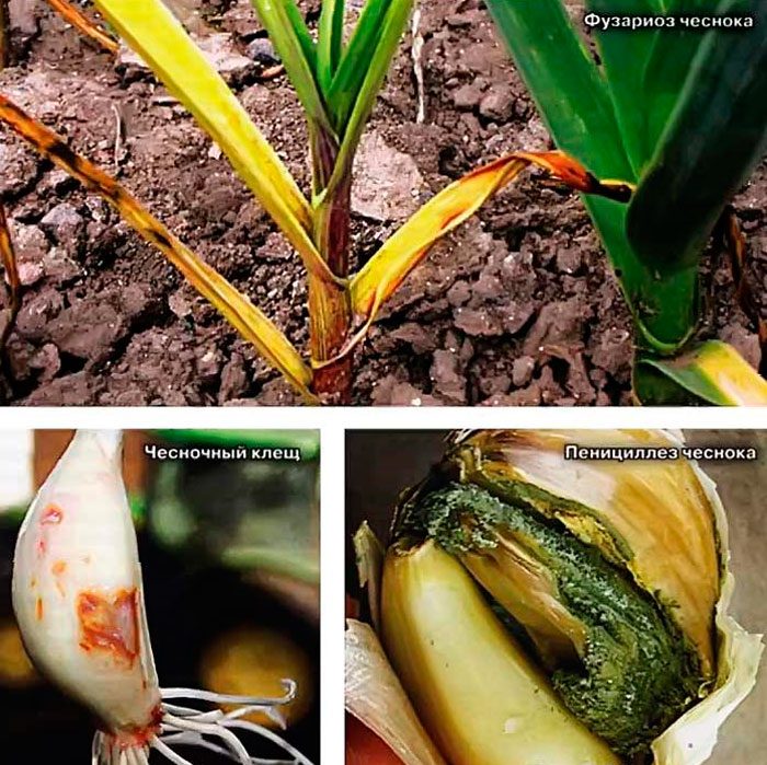 czosnek ma dość wysoką odporność na szkodliwe owady i choroby, ale nadal mogą wystąpić z nim problemy. Tak więc szkodliwe owady mogą go uszkodzić, takie jak: muchy cebulowe, wciornastki, ćmy, skradacze, szemraki, nicienie łodyg, roztocza korzeniowe i roztocza czosnku czworonożnego. Może również cierpieć na czarną pleśń, Fusarium lub zgniliznę DNA, peronosporozę lub mączniaka rzekomego i białą zgniliznę. Konieczne jest monitorowanie stanu krzewów natychmiast po pojawieniu się kiełków.
