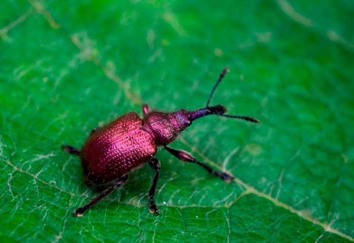 ryjkowiec rabarbarowy jest robakiem o długości około 0,6 cm, na powierzchni elytry znajduje się warstwa łusek o brązowym i szarawym kolorze. Takie szkodniki jedzą liście rabarbaru, a ich składanie jaj odbywa się w ogonkach liściowych. Z jaj wykluwają się beznogie, brudnożółte larwy, które żyją na liściach, jedzą je i przepoczwarczają tamże. Aby odstraszyć takiego szkodnika, należy spryskać krzak roztworem manganu potasu (5 gramów na 1 wiadro wody).