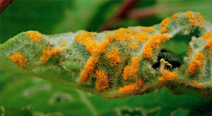 jeśli rabarbar jest dotknięty chorobą grzybiczą, taką jak rdza, wówczas krosty pojawiają się na powierzchni jego liści, gdy pękają, wylewa się z nich rdzawy proszek, który jest zarodnikami grzyba. W takiej roślinie obserwuje się uszkodzenie procesów metabolicznych, a także zmniejszenie wzrostu. Po przycięciu dotkniętych liści krzew będzie potrzebował 2 lub 3 zabiegów Topaz z przerwą 1,5 tygodnia.