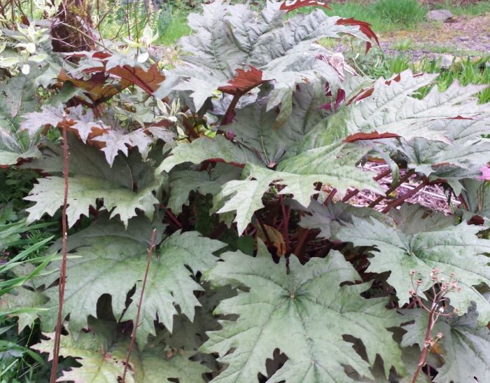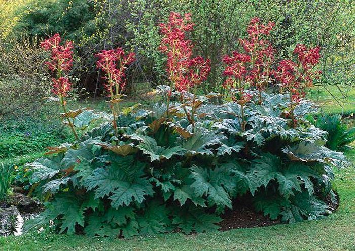 ojczyzną tego gatunku są górskie regiony południowych i Zachodnich Chin. Taka wieloletnia roślina ma duży korzeń i żebrowaną nagą łodygę o jasnoczerwonym kolorze, której wysokość wynosi około 200 cm, rozeta Podstawowa składa się z bardzo dużych pięcio-siedmiopłatkowych płytek liściowych, u podstawy mają kształt serca, a ich średnica wynosi około 0,8 m.kolejne ułożone płytki liściowe łodygi są prawie siedzące. Podczas otwierania liście mają purpurowy kolor, a następnie zmieniają się na prawie fioletowy, ale już w lipcu płytki stają się ciemnozielone, tylko ich Niewłaściwa powierzchnia pozostaje bladoczerwona. Długość kwiatostanów w kształcie wiechy wynosi około 0,5 m, składają się z kwiatów o jasnoróżowym, biało-zielonym lub jasnoczerwonym kolorze. Gatunek ten jest uprawiany od 1763 r.ma bardzo popularną odmianę ― Atrosanginium: kolor ogonków, liści i pędów jest fioletowy.
