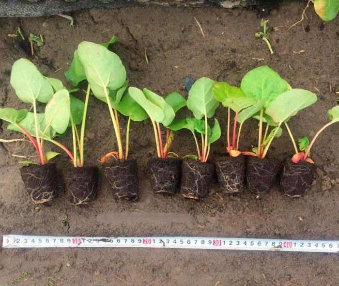 - Obski . Ta odmiana wyróżnia się mrozoodpornością i wilgocią. Rozeta składa się ze słabo zmatowionych dużych blaszek liściowych w kolorze zielonym, które osiągają średnicę około 1,2 m.grube i długie ogonki u podstawy są ciemnoróżowe, ich delikatny miąższ ma słodko-kwaśny smak.