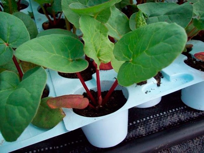 pojawienie się pierwszych sadzonek obserwuje się 15-20 dni po siewie. Gdy to nastąpi, doniczki z roślinami należy natychmiast przestawić w dobrze oświetlonym miejscu. Uprawa sadzonek rabarbaru jest dość prosta, w tym celu należy ją podlewać w odpowiednim czasie, poluzować powierzchnię mieszanki gleby, a także regularnie karmić (1 raz na 1,5 tygodnia).