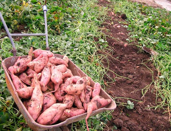 zbiory słodkich ziemniaków zaczynają być zbierane 14-16 tygodni po przesadzeniu sadzonek na otwartą glebę, z reguły czas ten przypada w połowie września. Nie zapominaj, że zbiory należy zbierać przed nadejściem mrozu, a do tego należy wybrać pogodny i suchy dzień. W tym czasie powinno rozpocząć się żółknięcie i suszenie liści i pędów. Jeśli bulwy zostały wykopane w deszczową pogodę, nie można ich przechowywać, w związku z tym należy je poddać recyklingowi, należy to zrobić również w przypadku uszkodzonych roślin okopowych. Aby usunąć bulwy z gleby, użyj widełek, a następnie należy je pozostawić na powierzchni witryny przez pewien czas, aby mogły dobrze wyschnąć. Konieczne jest bardzo ostrożne wykopanie ich z gleby, ponieważ ich długość może osiągnąć 0,3 m.gdy rośliny okopowe wyschną, resztki gleby należy usunąć z ich powierzchni, a następnie należy je posortować. Zdrowe i całe bulwy nadają się do przechowywania, a wszystkie zranione i budzące wątpliwości należy wysłać do przetwarzania. Te warzywa korzeniowe, które nadają się do przechowywania, należy umieścić w ciepłym miejscu (od 28 do 30 stopni) na 7 dni, a wilgotność powietrza powinna wynosić 85-90 procent, nie zapomnij systematycznie wentylować pomieszczenia. Następnie bulwy umieszcza się w niezbyt głębokich tacach i usuwa do przechowywania w chłodnym pomieszczeniu (od 10 do 15 stopni), tam będą przechowywane przez kilka miesięcy.