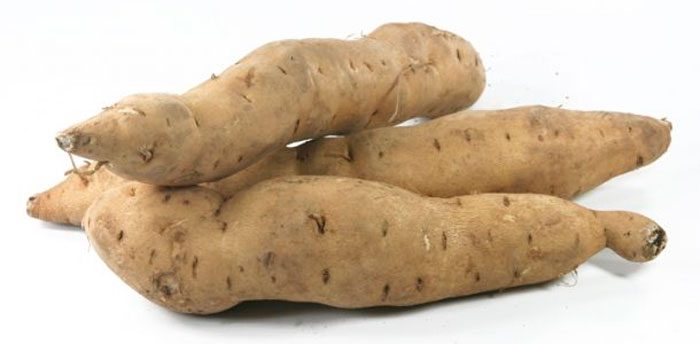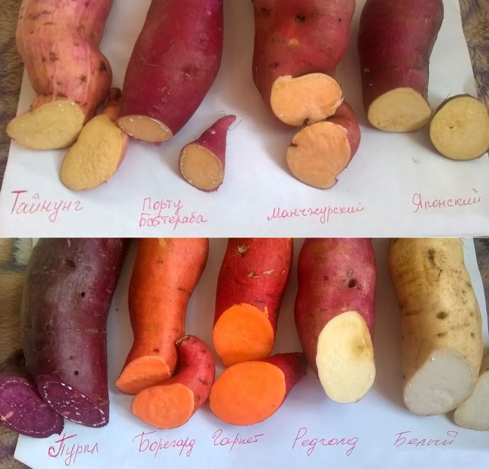- biały słodki ziemniak . Bulwy tej odmiany mają teksturę i smak bardzo podobny do ziemniaków. Taki słodki ziemniak dobrze rośnie na średnich szerokościach geograficznych i ma dość wysoką wydajność. Kształt lekkich roślin okopowych jest podłużny, ich miąższ jest biały.
