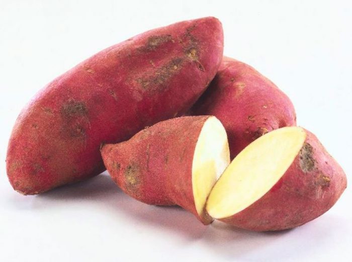 - Japoński . Ta odmiana jest wcześnie Dojrzała. W czerwonych roślinach okopowych miąższ ma blady kremowy kolor. W porównaniu z odmianami z pomarańczowym rdzeniem miąższ tej odmiany jest mniej słodki i bardziej suchy. Takie bulwy mogą zastąpić zwykłe ziemniaki.