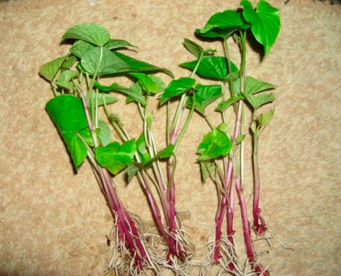 aby wyhodować takie sadzonki, będzie potrzebować pewnego reżimu temperaturowego ― od 20 do 30 stopni. Podlewanie powinno być umiarkowane, ale systematyczne. Chociaż roślina ta jest kochająca wilgoć, reaguje wyjątkowo negatywnie na stagnację wody w systemie korzeniowym. Do podlewania stosuje się wodę o temperaturze pokojowej, którą należy ustawić na 24 godziny.podlewanie odbywa się dopiero po wyschnięciu górnej warstwy mieszanki gleby. Pomieszczenie, w którym znajdują się sadzonki, powinno być systematycznie wentylowane, ale jednocześnie roślina powinna być chroniona przed przeciągiem. Zaleca się wietrzenie słodkich ziemniaków natychmiast po ich podlaniu. Po wysokości sadzonek wynosi 15 centymetrów i tworzą 4-5 międzywęźli, eksperci zalecają rozpoczęcie ich utwardzania, co pozwoli roślinom dostosować się do nowych warunków przed przesadzeniem ich na otwarty teren. Aby to zrobić, sadzonki codziennie przez 15 dni są przez pewien czas przenoszone na ulicę. Czas trwania takiej procedury musi być stopniowo zwiększany, aż będzie mógł być na świeżym powietrzu przez całą dobę.