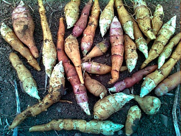 - znalezisko . Późna odmiana, charakteryzująca się wydajnością. Na słabo rozgałęzionych pędach duże płytki liściowe są asymetrycznie umieszczone. System korzeniowy jest zwarty, białe bulwy w kształcie gruszki w pobliżu oczu mają różowe smugi. Odmiana przeznaczona jest do uprawy w regionach południowych.