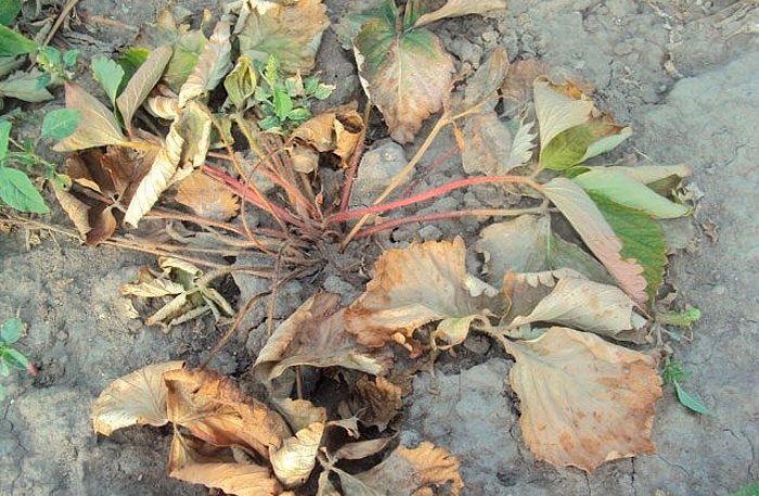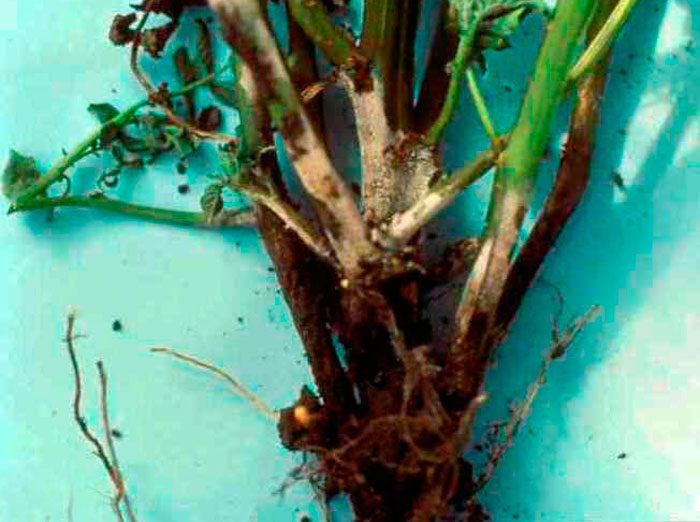 jest to choroba grzybicza, której rozwój występuje w 4 etapach. Dotknięte krzewy mają opóźnienie w rozwoju, praktycznie nie dają łodyg. W ostatnich tygodniach okresu letniego krzewy zmieniają kolor na żółty przed czasem i kończą sezon wegetacyjny bardzo wcześnie, podczas gdy system korzeniowy nie ma czasu na uformowanie się, a pąki nie mają czasu na ułożenie pędów u podstawy pędów, co ma bardzo negatywny wpływ na przyszłe zbiory. Z reguły te krzewy, które rosną na obszarach o przepuszczalnej dla wilgoci glebie, a także o wysokim poziomie wód gruntowych, są podatne na tę chorobę. Ponadto choroba zaczyna się intensywnie rozwijać w deszczową, wilgotną pogodę.