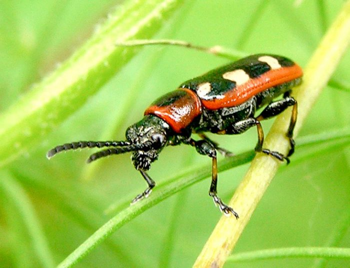 taki szkodnik został przywieziony z Europy Zachodniej wraz z tą kulturą. Chrząszcz ten ma ciemnoniebieski kolor, a na grzbiecie ma czerwoną obwódkę. Zjada kwiaty, owoce i zielone szparagi. Jego pojawienie się występuje wiosną, jednak od połowy lata obserwuje się największą liczbę szkodników.