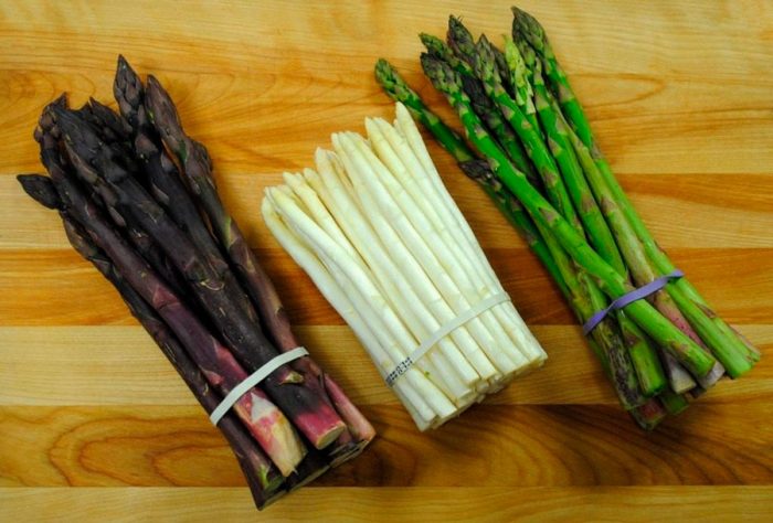 - białe szparagi lub bielone, etiolowane lub bezchlorofilowe. Pojawienie się tej odmiany miało miejsce na początku XIX wieku. W tamtych czasach to Moskwa była centrum destylacji i uprawy bielonych szparagów.