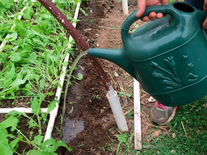 podczas kiełkowania nasion kultura potrzebuje najbardziej terminowego podlewania, a także w okresie tworzenia prawdziwych płyt liściowych i na etapie aktywnego wzrostu roślin okopowych. Gdy rośliny okopowe osiągną wymaganą objętość, ilość wody użytej do podlewania musi zostać zmniejszona, w przeciwnym razie mogą zacząć pękać.