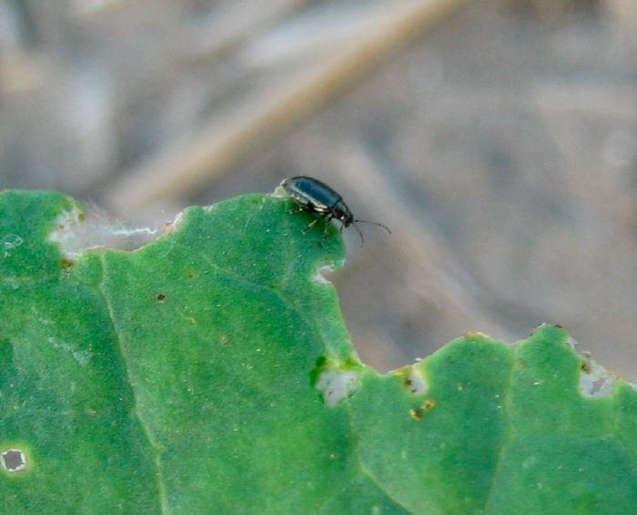 pchła krzyżowa jest bardzo małym robakiem liściastym, który ma tylne nogi skokowe, jak konik polny. Szkodnik ten może eksterminować młode sadzonki rzodkiewki, poważnie uszkadzając ich płytki liściowe.