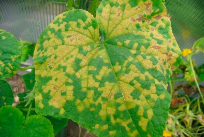 u roślin chorych na mozaikę kapusty na liściach tworzy się wzór, żyły stają się napięte, a płytki zdeformowane. W miarę rozwoju choroby wokół głównych żył tworzy się granica ciemnozielonego koloru, na powierzchni liści pojawiają się martwicze białawe plamy.