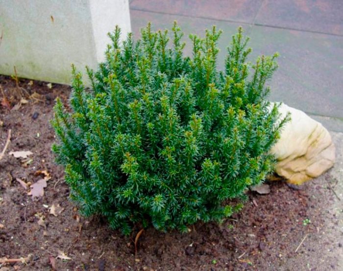 - Nana . Wysokość tak niskiej rośliny wynosi około 100 cm, gałęzie są potężne i rozłożone. Korona ma nieregularny kształt. Igły są bardzo puszyste. Kształt ciemnozielonych igieł jest liniowy, a ich długość sięga 25 mm.