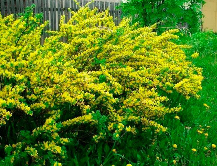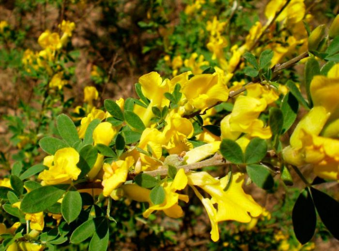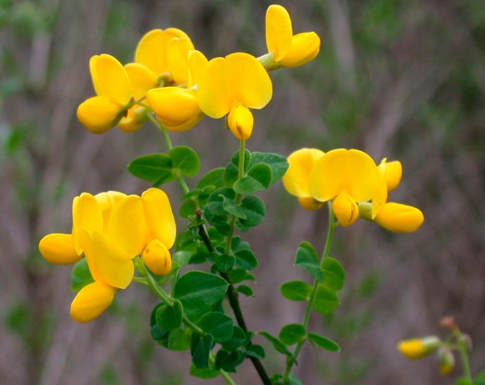 wysokość takiego krzewu liściastego wynosi około 1,5 m.na powierzchni zakrzywionych gałęzi znajduje się szara kora. Łodygi pokryte są pokwitaniem reprezentowanym przez jedwabisty stos. W skład trójlistkowych blaszek liściowych wchodzą listki lancetowato-eliptyczne, osiągają długość 20 mm, a na ich szczycie znajduje się kolc. Przednia powierzchnia płyty liściowej jest zielono-szara, a po niewłaściwej stronie pokryta jest gęstym pokwitaniem. Długość żółtych kwiatów wynosi około 30 mm, ich tworzenie odbywa się w zatokach liściowych, podczas gdy są one zbierane po 3-5 sztuk. Kwitnienie trwa około 1 miesiąca. Ten gatunek jest bezpretensjonalny i odporny na suszę.