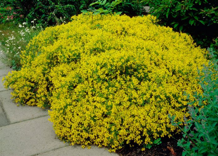 w warunkach naturalnych gatunek ten rośnie w południowej części Europy, taka roślina pochodzi z sosnowych jasnych lasów gór dalmatyńskich. Wysokość tego rozpostartego krzewu wynosi około 0,2 m, a jego średnica sięga 0,8 m.na powierzchni zielonych pięcioramiennych łodyg znajduje się pokwitanie. Pędy są łatwo ukorzenione. Ciemnozielone płytki liściowe są podłużne, lancetowate, na dolnej powierzchni mają pokwitanie. Osiągają długość 20 mm, Długość kwiatów o żółtym kolorze wynosi około 15 mm, są umieszczone w zatokach liści pojedynczo lub po kilka sztuk. Uprawiana od 1775 r. Gatunek ten jest odporny na mróz, ale w zbyt silnym mrozie krzewy mogą cierpieć.