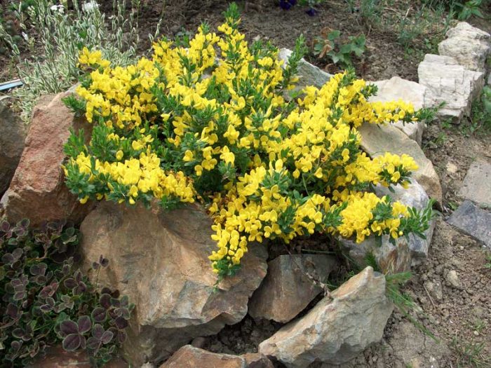 ta roślina pochodzi z gór Europy Południowej i Środkowej. Na wysokości pełzający krzew osiąga 0,6 m. rosnące gałęzie tworzą rozłożystą koronę. Krzew pokrywa dużą liczbę trójlistnych blaszek liściowych, kształt płatów jest szeroko eliptyczny. Gatunek ten jest szybko rosnący. Roślina zimą bardzo zamarza, ale wiosną jest w stanie szybko się zregenerować. Ten gatunek ma odmianę o wysokiej dekoracyjności-Atropurpurea: krzew jest rozłożysty, ozdobiony różowo-fioletowymi kwiatami. Popularna wśród ogrodników jest również hybrydowa rakitnik, zwana złotym deszczem, ma drugą nazwę-rakitnik Adama. Popularne odmiany: