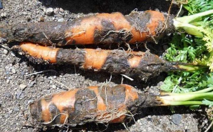 czarna zgnilizna ― na dotkniętej ropie pojawiają się zgniłe obszary czarnego węgla. Choroba ta stanowi największe zagrożenie dla jąder marchwi. Dotknięte marchewki należy usunąć i zniszczyć jak najszybciej. W celu zapobiegania nasiona są traktowane roztworem Tigama przed siewem (0,5%).