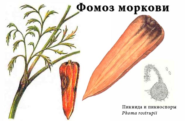 Fomoza-uszkadza łodygi jąder, a także ich kwiatostany. Następnie warzywa korzeniowe w górnej części pojawiają się brązowe plamki, które z czasem pogłębiają się i dochodzi do uszkodzenia całego warzywa korzeniowego. Na lekkiej glebie choroba ta rozwija się szybciej. W celach profilaktycznych przed wysiewem materiał siewny należy potraktować roztworem Tigama (0,5%), A zainfekowane rośliny okopowe należy natychmiast usunąć.