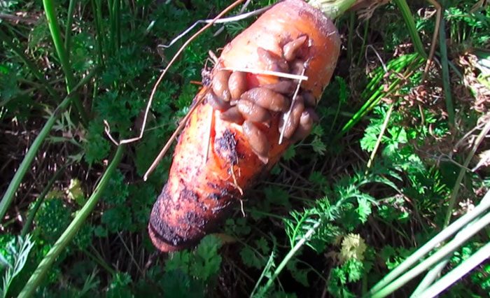 wireworm ― w rzeczywistości są to larwy ciemnego dziadka do orzechów. Mogą zaszkodzić nie tylko marchewkom, ale także takim uprawom, jak: ogórki, seler, truskawki, kapusta, pomidory i ziemniaki. Dorosły chrząszcz ma około 10 mm Długości, ma brązowo-czarny kolor, a elytra jest jasnoczerwona. Samica dziadka do orzechów składa jaja, które ma około 200 jaj. Wylęgają się z nich brązowożółte larwy o cylindrycznym kształcie, osiągają długość około 40 mm, ich rozwój obserwuje się przez 3-5 lat. Aby oczyścić obszar z wireworm, potrzebne będą również pułapki. Aby to zrobić, na stronie musisz zrobić kilka niezbyt głębokich dołów, w których umieszcza się kawałki dowolnego warzywa korzeniowego (ziemniaki, marchew, buraki itp.) lub na wpół dojrzałą trawę. Następnie dół jest pokryty ziemią i kładzie kołek, aby nie zapomnieć, gdzie się znajduje. Po kilku dniach dziurę należy wykopać, a przynętę, wraz ze zgromadzonymi w niej szkodnikami, zniszczyć.