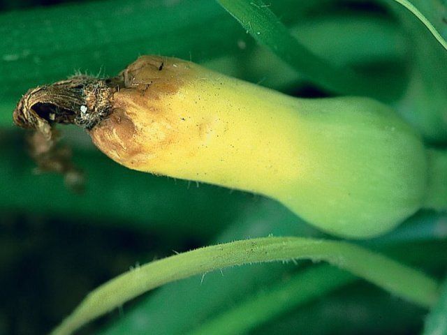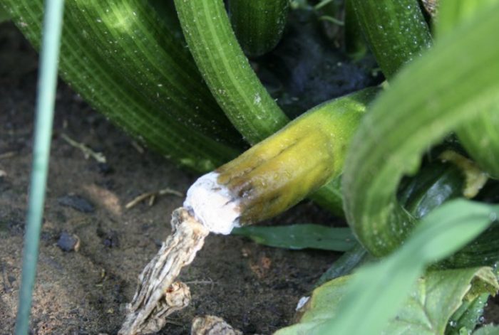 jeśli krzew jest dotknięty zgnilizną korzeni, wówczas jego dolne płytki liściowe zaczynają wysychać, owoce stają się żółte, a łodygi brązowe, podczas gdy w dolnej części stają się podobne do myjki. Najczęściej choroba ta rozwija się podczas sadzenia sadzonek w nieogrzewanej glebie, podlewania cukinii zimną wodą, a także w wyniku nadmiernie obfitego górnego opatrunku. Aby wyleczyć rośliny, musisz przestrzegać zasad ich pielęgnacji, a także spryskać je środkiem zawierającym miedź.