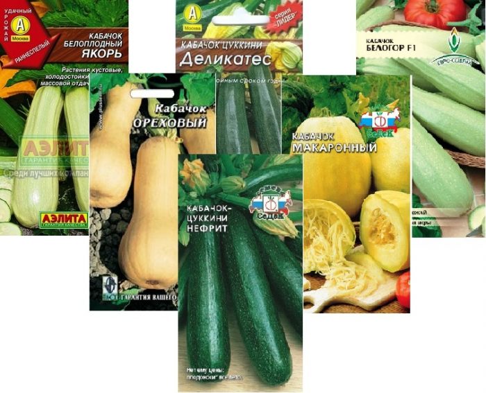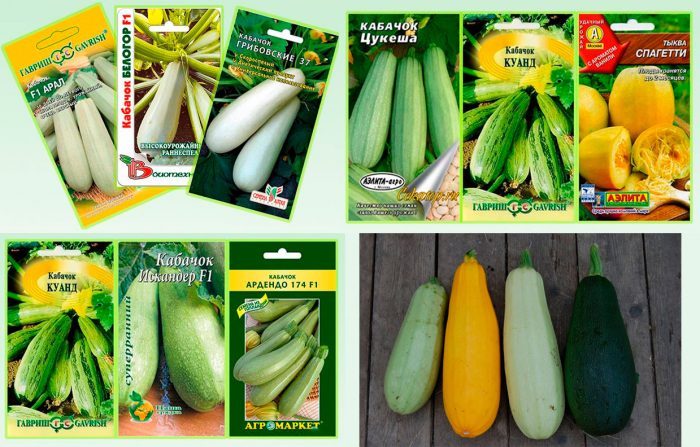 wszystkie cukinie są podzielone na zwykłe (białe owoce) i cukinię. W cukinii płytki liściowe są silnie rozcięte, często mają białe plamki w pobliżu żył, ich niedoświadczeni ogrodnicy mogą być mylone z objawami mączniaka prawdziwego. Dynie cukinii mogą być pomalowane na zielono lub żółto o różnej intensywności. Na przykład cukinia to następujące odmiany: czarny przystojny, Astoria, Aeronautyczny, Szary, Żółty, Kaserta, markiza, Zebra, Tsukesha, Negritenek; a także hybrydy: Jan, Golda, Vanyusha, Jadeit, Diament, Defender, Kandela i Masza. Cukinia białopłodna obejmuje następujące odmiany: Kotwica, walec, Spaghetti, Belogor, Gribovsky 37; a także hybrydy: Cavili i Sangrum.