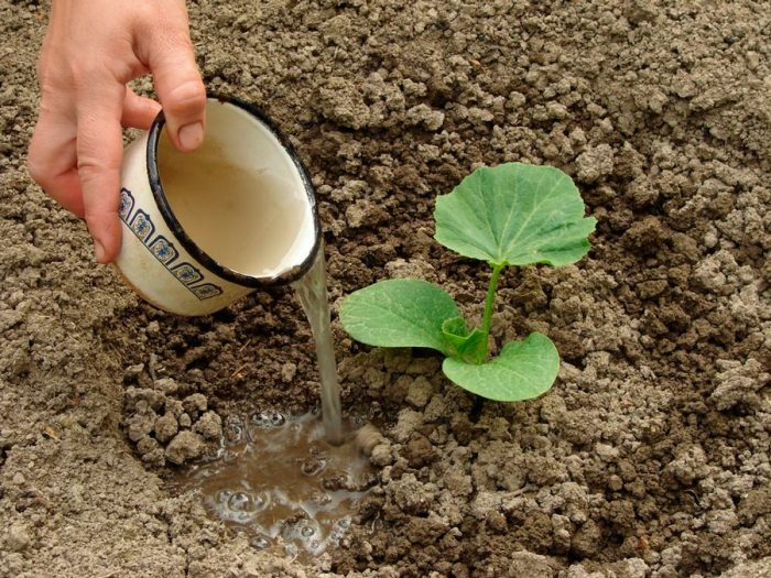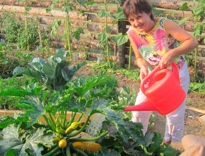 podlewaj Krzaki wieczorem, używając do tego wody, która ogrzała się na słońcu w ciągu dnia. W upalne dni przed zamknięciem liści cukinii należy je codziennie podlewać. Kiedy liście zamkną się i pokryją powierzchnię łóżka, krzaki będą musiały być podlewane rzadziej, z reguły 1 raz na 5 lub 6 dni, jeśli Na zewnątrz jest chłodno i pochmurno, a przy upalnej pogodzie ― 1 raz na dwa lub trzy dni. Podczas podlewania ostrożnie wlewa się wodę pod korzeń, a aby chronić dojrzewające owoce przed gniciem, umieszcza się pod nimi wodoodporny materiał (na przykład kawałek łupka lub deskę). Jeśli w gorącym czasie liście na krzakach stają się ospałe, to wieczorem należy je podlać przez dyszę z małymi otworami.