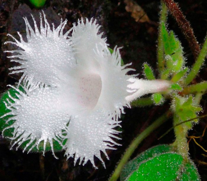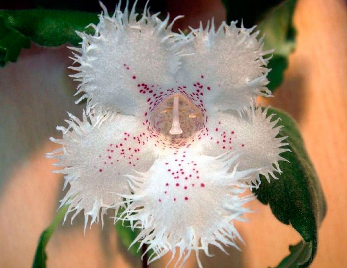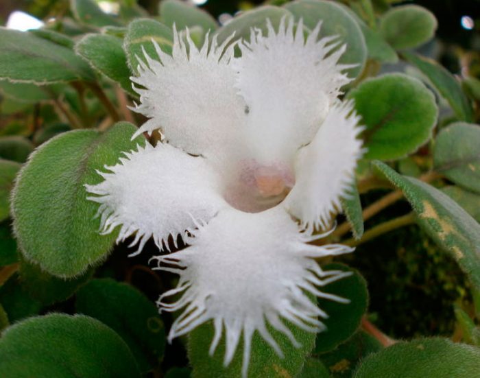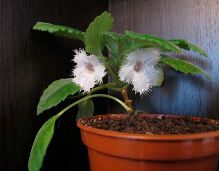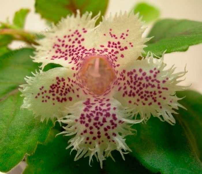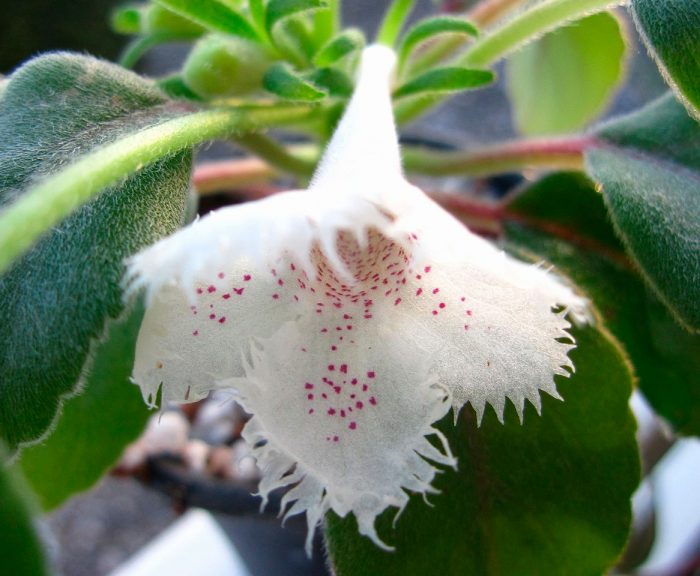 ta odmiana została również wyhodowana specjalnie do uprawy w pomieszczeniach. Na powierzchni dużych niebieskawo-zielonych liści występuje pokwitanie, ich krawędź jest ząbkowana. Na wierzchołkach płatków białych kwiatów znajduje się grzywka, a ich ziew ozdobiony jest plamkami czerwonego lub różowego odcienia.