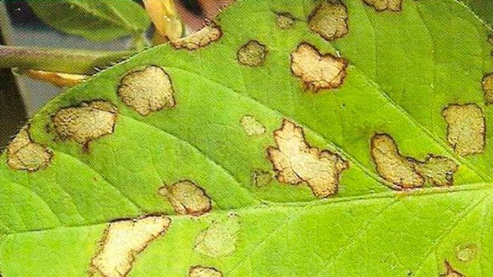 na powierzchni blaszek liściowych powstają okrągłe plamki i jasnoróżowy lub brązowy kolor. Z czasem takie plamy stają się większe. Na zainfekowanych płytkach liściowych pojawiają się dziury, obserwuje się również zwijanie się liści i suszenie całego krzewu. Występuje przerzedzenie rzęs, które stają się bardzo kruche, a dynie są zdeformowane i pojawia się na nich zgnilizna. Zainfekowane melony należy spryskać mieszanką Bordeaux (1%), podczas gdy wymagane będą 3 lub 4 zabiegi, które są przeprowadzane 1 raz na 1,5 tygodnia. Zamiast tego cały obszar melonów można zapylić proszkiem siarki.