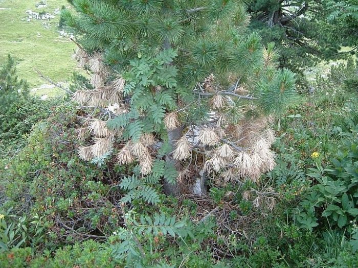 shutte Brown-ta choroba atakuje młode drzewa. Igły na nich są pomalowane na brązowo-brązowy kolor i wysychają, ale nie kruszą się i nadal pozostają na gałęziach przez długi czas. Wszystkie zainfekowane gałęzie należy usunąć, a drzewo spryskać środkiem grzybobójczym.
