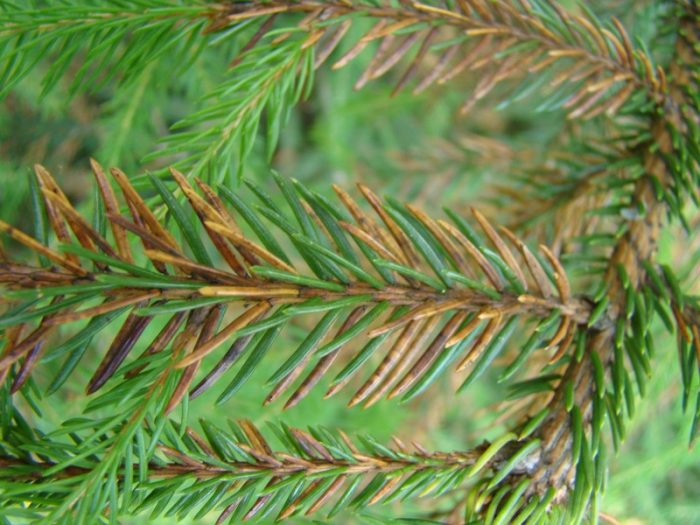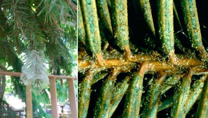 przędziorek-ten pajęczak stanowi największe zagrożenie dla choinki. W upalnym i suchym czasie Szkodnik ten wykazuje największą aktywność. Kleszcz wysysa sok komórkowy z drzewa. Fakt, że ten szkodnik osiadł na roślinie, można zrozumieć dzięki obecności sieci i wielu małych punktów na powierzchni igieł. Jeśli jest wiele kleszczy, drzewo zaczyna żółknąć, a igły, na których znajdują się podobne pajęczaki, są pomalowane na jaśniejszy, prawie biały kolor. W porze suchej i dusznej, w celu zapobiegania wieczorem, konieczne jest spryskanie igieł świerkowych. Chora roślina jest traktowana akarycydami, na przykład: Flumait, Borneo, Apollo lub Floromait. Środki owadobójcze, na przykład: Agravertin, Oberon, Actellic lub Akarin, pomogą również poradzić sobie z tym problemem. Aby zniszczyć wszystkie roztocza, konieczne będzie kilka oprysków.