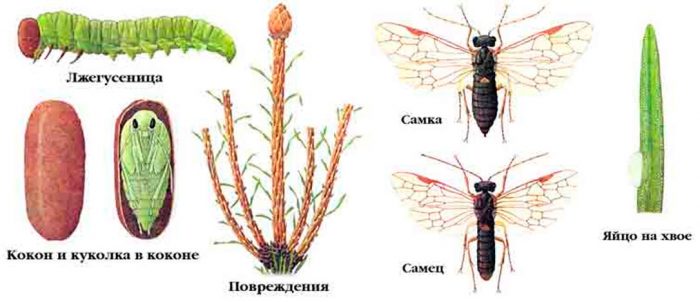 zwykłe piły świerkowe-długość tych małych owadów nie przekracza 0,6 cm, mają żółty lub ciemny kolor. Najczęściej osiedlają się na młodych jodłach, ale ich masowe rozmnażanie obserwuje się na choinkach, których wiek wynosi 10-30 lat. Dotknięte drzewa mają spowolnienie wzrostu, gołe końce łodyg, z tego powodu ich Korona zaczyna się zaokrąglać. Igły na jodłach, na których osiadł ten szkodnik, są pomalowane na brązowo-czerwony kolor, podczas gdy nie kruszą się, ale pozostają na gałęziach przez długi czas. W celach profilaktycznych konieczne jest kopanie gleby w Kole pnia, niszcząc gniazda piły. W przypadku silnej infekcji larwy młodszych grup wiekowych należy spryskać roztworem środków owadobójczych, na przykład: Actellik, BI-58, Decis i Fury.