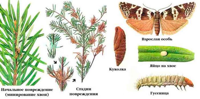 świerkowy liść-igloed ― ten brązowy motyl ma rozpiętość skrzydeł 1,3 - 1,4 cm gąsienice tego motyla są szkodliwe dla tej kultury, są pomalowane na jasnobrązowo-żółty kolor, a para ciemnych pasków biegnie wzdłuż ich pleców. Zrozumienie, że igłówka osiadła na roślinie, jest dość proste, ponieważ na łodygach pojawiają się skupiska igieł o rdzawym kolorze, a jednocześnie są one połączone dość rzadkimi delikatnymi włóknami. Szkodniki te wydobywają igły rośliny, wykonując okrągłe otwory u podstawy. Jeśli dotknięte obszary są małe, należy je wyciąć i zniszczyć, a świerk następnie spryskać roztworem zielonego mydła.