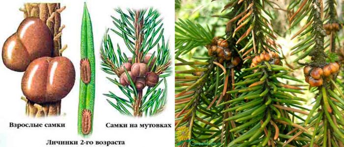 Świerkowa fałszywa tarcza ― ten szkodnik ma ochronną gładką błyszczącą brązową skorupę, w związku z tym leczenie dotkniętego drzewa środkami owadobójczymi będzie nieskuteczne. Pod tarczą taki szkodnik organizuje składanie jaj, w którym znajduje się około 3 tysięcy jaj, z których w lipcu pojawiają się jasnoróżowe larwy. Żywią się sokiem z tej rośliny. Z powodu larw obserwuje się krzywiznę i śmierć końcówek łodyg, długość igieł zmniejsza się, staje się brązowa i kruszy się. Wzrost dotkniętego świerka staje się bardzo powolny. Ponadto, w wyniku aktywności życiowej takiego szkodnika, na powierzchni drzewa pozostaje spadziowa, na której osiedlają się grzyby. Szczególnie niebezpieczne są fałszywe tarcze dla choinek uprawianych na suchych glebach lub w zacienionym miejscu. W celu zapobiegania zaleca się przestrzeganie zasad techniki rolniczej tej kultury, a także regularne profilaktyczne opryskiwanie młodych świerków środkami owadobójczymi, zwłaszcza w okresie pojawienia się larw z jaj.