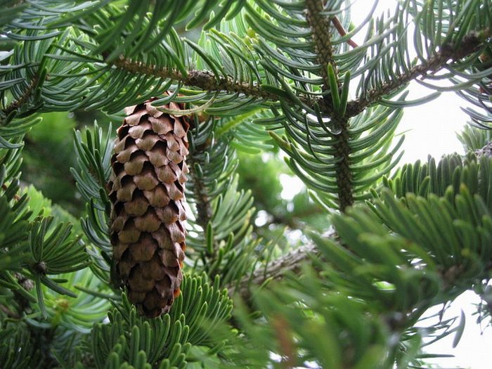 - Doumeti . Wysokość drzewa odpornego na mróz wynosi około 6 metrów. Bujna korona ma kształt szerokokoniczny. Istnieje wiele rosnących gałęzi. Niebieskawe igły są bardzo bujne. Szyszki rosną na pniu rośliny.