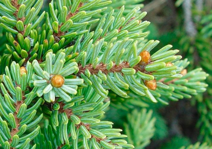 rdza igieł jest tą chorobą grzybiczą. W zainfekowanym drzewie w pierwszych tygodniach letnich na igłach pojawia się duża liczba cylindrycznych pęcherzyków, które osiągają średnicę 20-30 mm, znajdują się w nich zarodniki. Po dojrzewaniu zarodników skorupa pęcherzyka pęka i następuje ich rozproszenie i osiadanie na powierzchni pobliskich roślin. Ta choroba jest najbardziej niebezpieczna dla młodych choinek, ponieważ z jej powodu igły zaczynają umierać przed czasem. Aby wyleczyć roślinę, a także zapobiec jej infekcji, w pierwszych dniach czerwca spryskuje się ją roztworem mieszanki Bordeaux (1%) lub innym środkiem grzybobójczym o podobnym działaniu. Wszystkie latające igły muszą być systematycznie zbierane i niszczone. Nie zapomnij również usunąć chwastów z witryny w odpowiednim czasie. Takie drzewo może również zachorować na rdzę szyszek. Dotknięte guzki należy usunąć z rośliny natychmiast po ich wykryciu. Walcz z taką chorobą w taki sam sposób, jak z rdzą igieł.