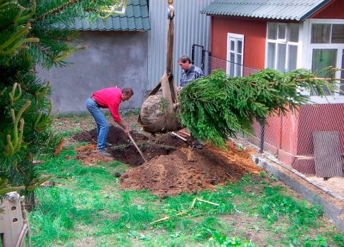 jeśli wysokość drzewa nie przekracza 200 cm, możesz go wykopać własnymi rękami, w tym celu wykopuje się go w promieniu wykopu, wszystkie pozostałe korzenie należy odciąć. W choince w tym wieku korzenie sięgają głębokości 0,6 m. dlatego konieczne jest wykopanie rośliny na taką głębokość. Weź konopie i umieść je pod korzeniami, nadal musisz owinąć glinianą bryłę. Następnie drzewo jest usuwane z gleby i dostarczane do nowego otworu do sadzenia. Jeśli przesadzone drzewo ma ponad 200 cm, musisz użyć karczownika, jest on w stanie utrzymać system korzeniowy wraz z glinianą bryłą, a także koroną, nie raniąc ich. Na dnie wykopu należy położyć warstwę drenażową, ściółkę leśną, a następnie warstwę suchych liści. Dopiero potem drzewo umieszcza się w otworze do sadzenia, podczas gdy jego szyjka korzeniowa powinna wznosić się 50-70 mm nad powierzchnią witryny. Należy również zauważyć, że podczas instalacji drzewa w otworze należy zachować jego orientację w kierunku "południe-północ". Pozostałe puste przestrzenie w wykopie należy wypełnić przygotowaną mieszanką ziemi, podczas gdy należy ją tylko lekko ubić. Następnie pobiera się kilka potężnych palików i wbija się w ziemię wzdłuż obwodu otworu do sadzenia, a odległość między nimi powinna być taka sama. Następnie drzewo jest przywiązane do tych palików na rozstępach, co pozwoli przeszczepionej roślinie nie spaść z podmuchów wiatru. Powierzchnia koła pnia powinna być pokryta warstwą torfu, latających liści, próchnicy lub świerkowych gałęzi. Po osiadnięciu gleby w wykopie szyjka korzenia świerka powinna znajdować się na tym samym poziomie co powierzchnia terenu.