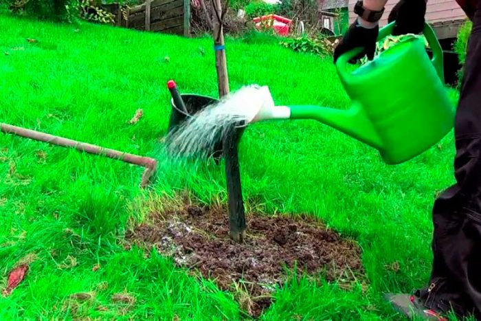 kiedy jabłoń zostanie posadzona, musisz dobrze zagęścić glebę w Kole pnia, w tym celu należy ją przyciąć. Następnie musisz wycofać się z pnia o około 50 centymetrów i zrobić wałek o wysokości piętnastu centymetrów. Następnie wlej 2,5-3 wiadra wody do koła pnia. Po całkowitym wchłonięciu cieczy do gleby powierzchnię koła pnia należy wypełnić trzy centymetrową warstwą ściółki (torfem lub humusem). Następnie roślina jest podwiązana do kołka.