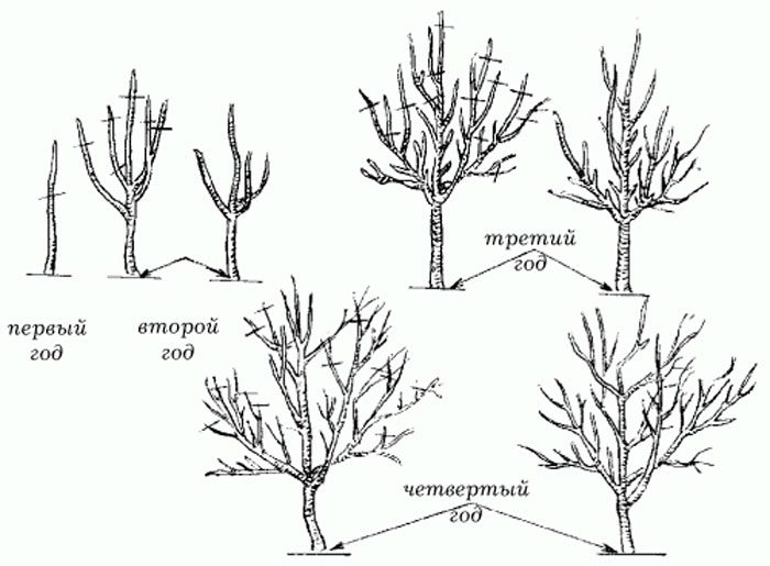 pędy boczne, które nie biorą udziału w tworzeniu szkieletu drzewa, muszą być cięte na 3 liście, a pędy drugiego rzędu na pierwszy liść od ich podstawy. Takie procedury zaczynają się przeprowadzać od ostatnich dni lipca i kończą je tylko wtedy, gdy długość nieobrzezanych pędów osiągnie 20 centymetrów. W trzecim sezonie i wszystkich kolejnych roślina powinna być cięta w tej samej kolejności, w tym celu przewodnik skraca się o 20 centymetrów na nerkę, która znajduje się w przeciwieństwie do zeszłorocznego cięcia, co pozwoli zachować jej pionową pozycję. Gdy jabłoń osiągnie wymaganą wysokość, każdego roku konieczne będzie przycięcie całego wzrostu przewodnika. Gdy długość gałęzi szkieletowych będzie równa 0,45 - 0,5 M, ich przyrosty boczne będą również musiały zostać przycięte. W razie potrzeby musisz przerzedzić zarastające gałęzie. Aby gałęzie owocujące były skierowane poziomo, należy je skrócić o wzrost zorientowany w dół. Aby kształt korony pozostał piramidalny, konieczne jest kontrolowanie wzrostu górnych gałęzi.