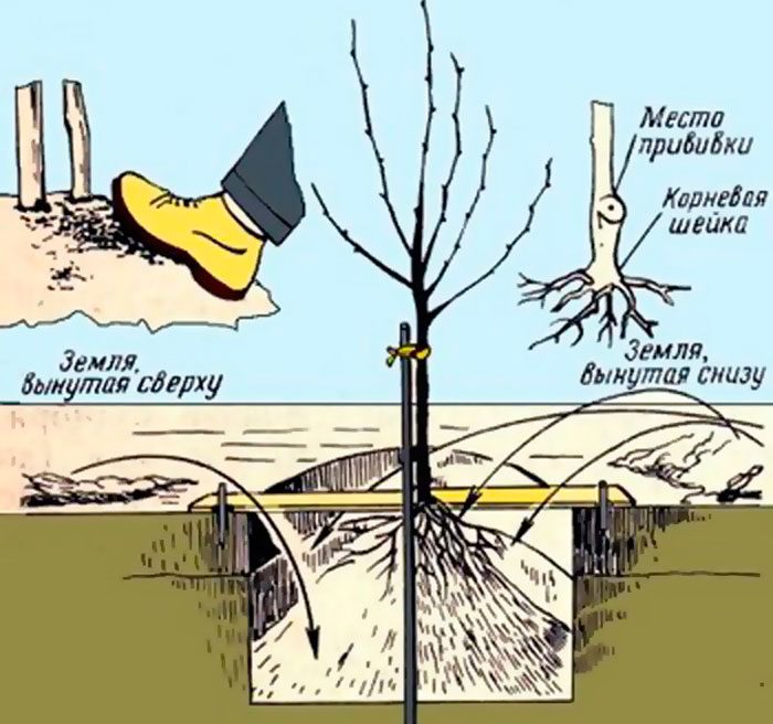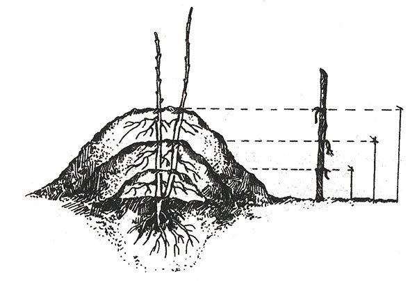 wiosną konieczne jest zainstalowanie kołka w środku wykopu, wokół którego gleba wylewa się z górnej warstwy kopcem. Sadzonka jest instalowana na tym wzgórzu, a następnie sadzenie odbywa się zgodnie z tym samym planem, co jesienią.