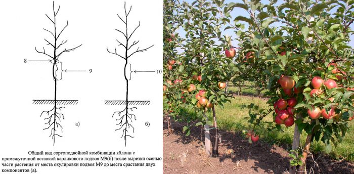 podkładki karłowate mają jedną wielką wadę, ich system korzeniowy znajduje się bardzo blisko powierzchni gleby, a zatem może zostać poważnie uszkodzony z powodu silnych mrozów w śnieżnej zimie, co często prowadzi do śmierci drzewa. Ale możliwe jest pozbycie się tej wady. Aby to zrobić, musisz zastosować połączoną metodę tworzenia karłowatego drzewa jabłkowego za pomocą wstawki interkalarnej ― jest to pośrednie ogniwo między podkładką silnie rosnącej jabłoni i sadzonką odmianową, która jest sadzonką drzewa karłowatego. W rezultacie powstaje trzypiętrowa konstrukcja: najpierw jest dobrze rozwinięty i potężny system korzeni silnie rosnącego drzewa jabłoni, następnie szczepiona jest na nim łodyga karłowatej jabłoni, a następnie szczepiona jest już na niej łodyga odmiany uprawnej. Drzewa z podobnymi wstawkami można sadzić na otwartej ziemi na wiele sposobów: