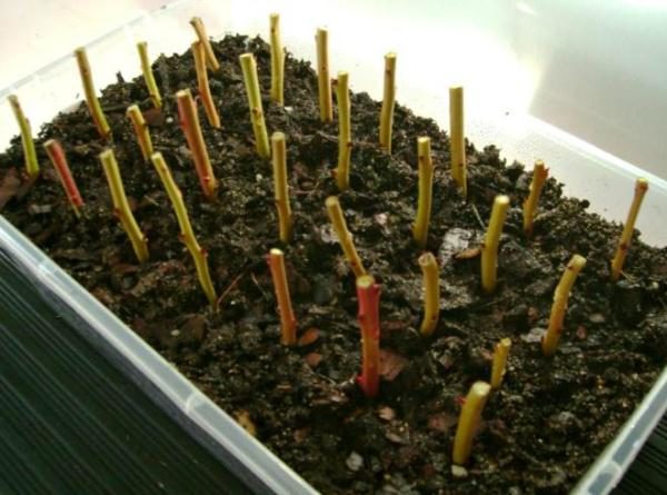 zbiór zdrewniałych sadzonek odbywa się jesienią podczas pobierania warstw z gleby. Długość cięcia z etiolowaną dolną częścią powinna wynosić co najmniej 0,2-0,3 m.sadzonki przed sadzeniem umieszcza się w piwnicy, zakopuje w wilgotnym torfie lub piasku i utrzymuje w temperaturze 2-5 stopni. Na początku okresu wiosennego sadzonki te są sadzone w nieogrzewanej szklarni, podczas gdy między nimi należy zachować odległość 10 centymetrów, należy również wziąć pod uwagę, że tylko 2 lub 3 pąki powinny pozostać nad powierzchnią witryny. Aby sadzonki były dobrze ukorzenione, konieczne jest utrzymanie wysokiej wilgotności w szklarni (od 75 do 80 procent).