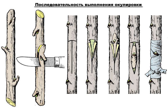 pączkowanie odbywa się w połowie lipca. Musisz wziąć tarczę z okiem sadzonki odmianowej, ogonkiem liściowym i cienką warstwą drewna, która jest wprowadzana do cięcia kory karłowatej podkładki, która ma kształt litery T i znajduje się nieco powyżej kolana. Następnie miejsce szczepienia należy owinąć taśmą pączkującą, można wziąć inny dość elastyczny materiał, a oko z ogonkiem nie powinno być zamknięte. Po 15-20 dniach tarcza powinna całkowicie rosnąć razem z podkładką. Aby pączkowanie było dokładnie udane, 2 Oczy tej samej odmiany są szczepione jednocześnie i umieszczane po przeciwnych stronach podkładki. Po dokładnym zapuszczeniu osłony konieczne będzie usunięcie taśmy pączkującej, a wraz z nadejściem wiosny konieczne będzie odcięcie podkładki na szczepionej nerce, po czym podstawa pędu wyrasta z zaszczepionego oka. Następnej wiosny będzie można zacząć formować koronę karłowatego drzewa jabłkowego.