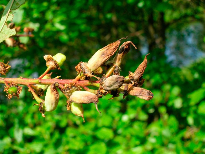 jeśli na powierzchni płyt liściowych pojawiły się małe martwice o nieregularnym kształcie, oznacza to, że drzewo jest dotknięte cercosporozą. Na przedniej powierzchni płytki liściowej mają białawy kolor, a na niewłaściwej ― brązowy. Z czasem łączą się, a także dochodzi do zniszczenia i wysypki dotkniętej tkanki. Aby pozbyć się takiej choroby, drzewo należy leczyć lekiem Topaz, który należy stosować zgodnie z instrukcjami.