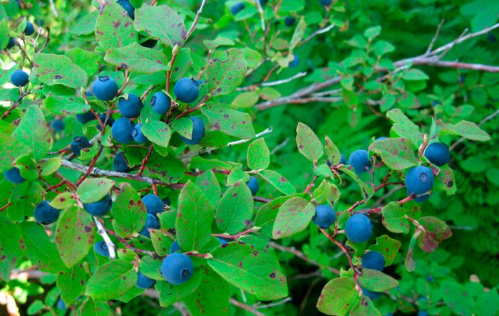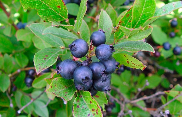 jagody to mały krzew liściasty, którego wysokość może wynosić od 0,1 do 0,5 m.ostre gałęzie, pomalowane na Zielono, odchodzą od pnia pod ostrym kątem. Krótkołańcuchowe regularnie rozmieszczone płytki liściowe o zaokrąglonym kształcie piłkowane wzdłuż krawędzi wiosną i latem mają zielonkawy kolor, który jesienią zmienia się na czerwony. Pęd lądowy przechodzi w kłącze, odchodzą od niego małe rozgałęzione korzenie, które wnikają w głąb ziemi tylko 50-60 mm. Opadające pojedyncze kwiaty o różowo-zielonym kolorze znajdują się na krótkich szypułkach u podstawy młodych gałęzi. Owocem jest jagoda o jajowatym lub kulistym kształcie, o średnicy 0,6-1 cm i ciemnoniebieskim kolorze, na powierzchni znajduje się niebieskawa powłoka. Krzew kwitnie w maju lub czerwcu, a owocowanie obserwuje się od lipca do września.