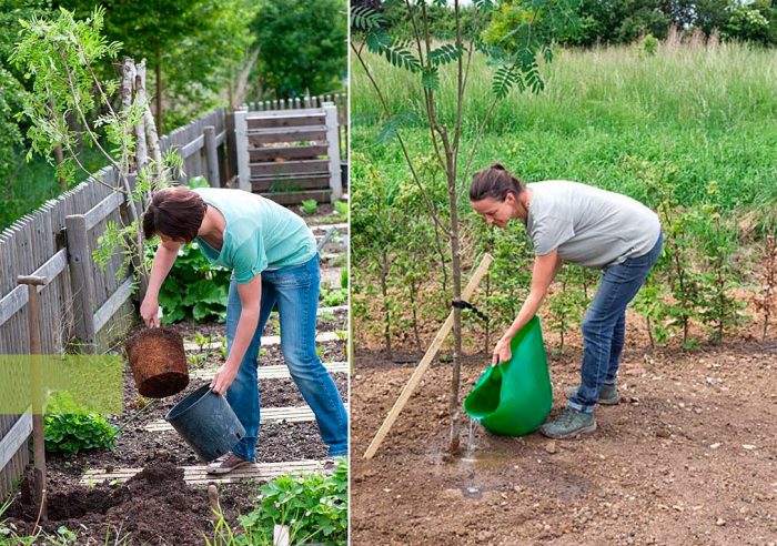 system korzeniowy rośliny należy zanurzyć w glinianej gadule, a następnie natychmiast zainstalować na środku wykopu, który jest pokryty glebą z górnej warstwy lub resztkami mieszanki gleby. Po posadzeniu rośliny powierzchnia gleby wokół niej musi być ubita, a następnie dobrze podlewana. Drzewo należy sadzić 20-30 mm głębiej niż uprawiano w szkółce. Po całkowitym wchłonięciu płynu do koła pnia po podlaniu jego powierzchnia musi być pokryta warstwą ściółki (torf, trawa, trociny, próchnica, siano, słoma lub inny materiał organiczny), której grubość może wynosić od 5 do 10 centymetrów.