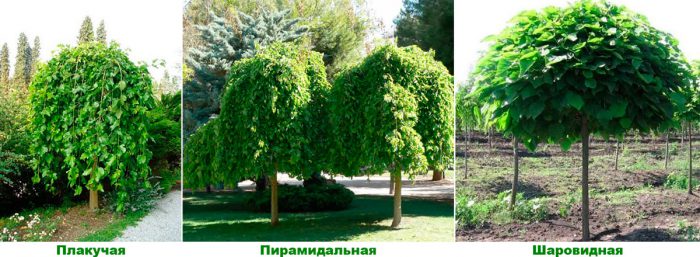 - piramidalna . Wysokość takich roślin o wąskiej piramidalnej koronie nie przekracza 8 metrów. Blachy są łopatkowe.