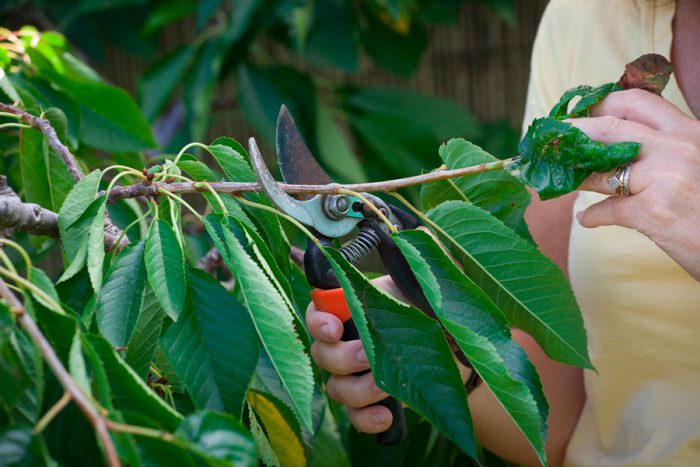 jesienią przycinanie odbywa się po tym, jak wszystkie liście spadną z drzewa. Ale eksperci zalecają przeprowadzenie tej procedury do końca września, w przeciwnym razie plastry na gałęziach zagoją się znacznie gorzej. Jeśli odetniesz wszystkie słabe i zranione krany, a także te, które nie rosną prawidłowo, wiśnie łatwiej przetrwają zimę. Skróć nie szkieletowe gałęzie do 0,3 m, ale roczne pędy ― o 1/3 części. W roślinach poniżej 5 lat długość gałęzi nie powinna przekraczać pół metra. Jesienią zaleca się cięcie wiśni piłą, ponieważ takie cięcia goją się znacznie szybciej w porównaniu z tymi pozostawionymi przez sekatory.