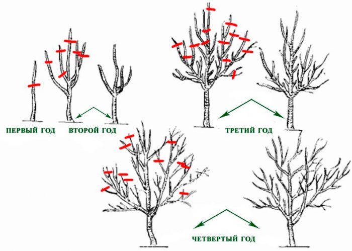 owocowanie tej kultury obserwuje się na gałęziach bukietów i rocznych pędach. Należy pamiętać, że taka roślina ma intensywny wzrost pędów, które po przycięciu odrastają dosłownie natychmiast, ale nie są zdolne do rozgałęzienia. W związku z tym formowanie korony odbywa się z gałęzi szkieletowych wzdłuż poziomów. Proces ten jest długi, ponieważ w sezonie 1 w większości przypadków nie można położyć nawet 1 poziomu. Formowanie pierwszego zwartego poziomu odbywa się z gałęzi, które znajdują się wzdłuż pnia w odległości 10-20 centymetrów od siebie. Na każdym z dwóch kolejnych poziomów gałęzi powinno być o jeden mniej, podczas gdy powinny być umieszczone asymetrycznie i być stosunkowo słabsze. Między poziomami należy zachować odległość w zakresie 0,7-0,8 m. po ułożeniu trzeciego poziomu w tym samym sezonie na pierwszym poziomie należy utworzyć 2 lub 3 gałęzie drugiego rzędu, które powinny być równomiernie rozmieszczone w stosunku do przewodnika, a odległość między nimi powinna wynosić co najmniej 0,6-0,8 m. w następnym sezonie formują się gałęzie pół ― szkieletowe na drugim poziomie, a po kolejnym 1 roku-na trzecim.