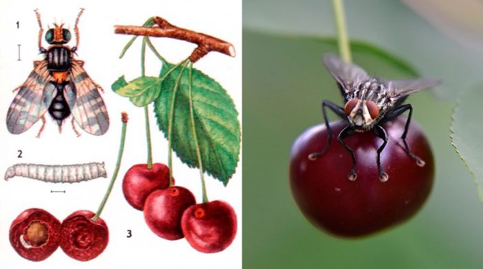 mucha wiśniowa jest równie bardzo niebezpieczna dla wiśni i wiśni. Może zniszczyć około 90 procent całej uprawy. Larwy takiego szkodnika jedzą nektar z kwiatów, a także wysysają sok z jagód, w wyniku czego są uszkodzone. Największe niebezpieczeństwo takiego szkodnika stanowi dla średnio-i późno dojrzewających odmian wiśni. Jagody uszkodzone przez szkodnika stają się ciemne, zaczynają gnić i kruszą się. Larwy wybrane z opadłych owoców zakopują się w glebie. Aby złapać takie muchy, użyj specjalnych pułapek. Do ich produkcji stosuje się sklejkę lub plastik, są one pomalowane na nasycony żółty kolor, a następnie pokryte klejem entomologicznym lub wazeliną. Gotowe pułapki są zawieszone na wiśni na wysokości 150-200 cm po 3 dniach sprawdź pułapki, jeśli znajdziesz na nich co najmniej 5-7 much, spryskaj wiśnie Konfidorem lub Aktellikiem. Jeśli roślina została spryskana Konfidorem, ponowne traktowanie tym samym środkiem odbywa się 20 dni po pierwszym, a jeśli Actellik ― to po 15 dniach. Ostatni raz wiśnie można przetworzyć nie później niż 20 dni przed zbiorem owoców odmian średnio - i późno dojrzewających.